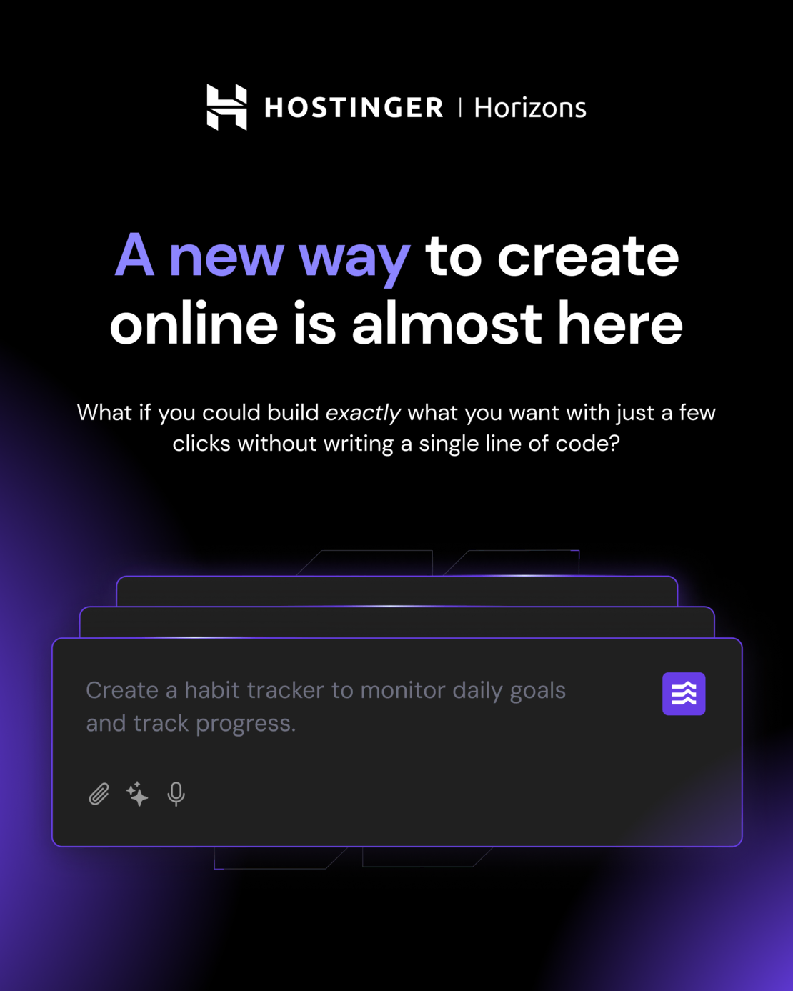 We are launching Hostinger Horizons, a new AI tool that enables anyone to build, edit, and publish custom web apps without writing a single line of code or using third-party connections.