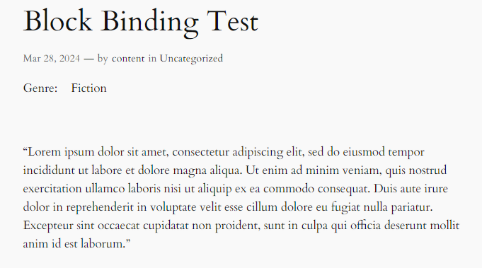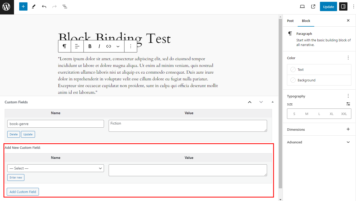 However, with simple code, we can put it to practical use. In the Block Binding API developer note, the WordPress Core team provides an example of binding a paragraph block to a custom field.