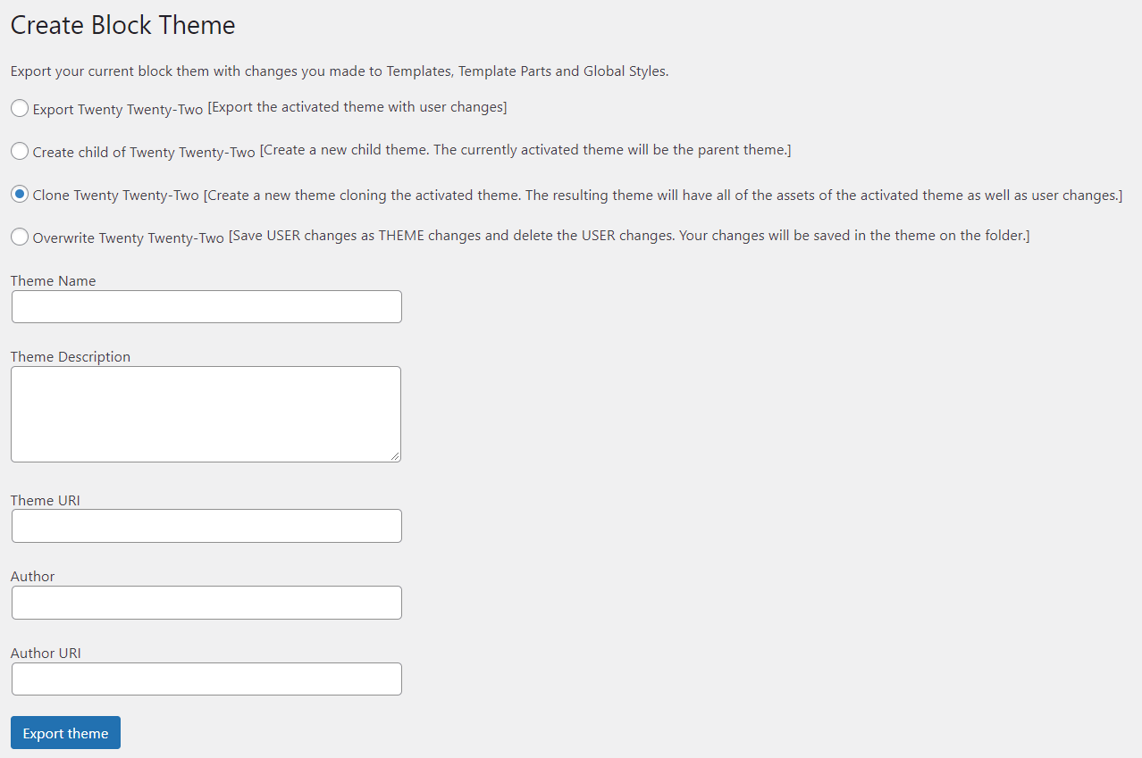 - If users select the create a child theme or clone the current theme options, they’ll see fields to fill in their theme information (theme name, theme description, theme URI, author, and author URI)