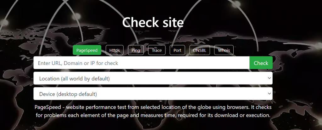 - Fill in the information required — your website domain or URL and the test location. Choose All World in the location tab if you want to check your site status around the globe, then click CHECK.