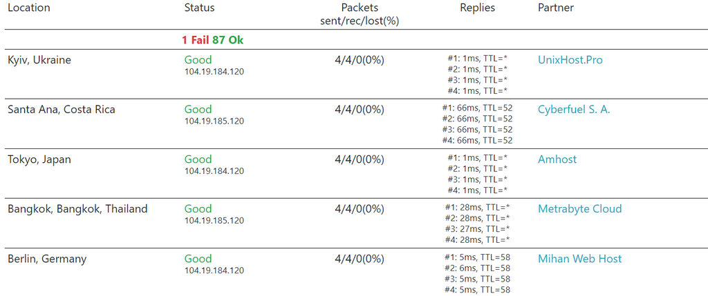 If you see results similar to the one above, your website is online. You should ignore one or two fails because it might be due to network-side or configuration issues. If the majority of checks are Good, then you can be sure that your website is online globally.