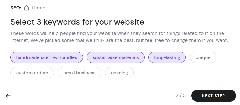 With our SEO feature on Hostinger’s website creator, you can effortlessly generate high-performing SEO keywords.