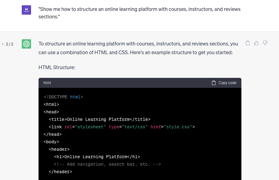 - “Show me how to structure an online learning platform with courses, instructors, and reviews sections.”