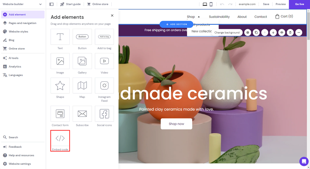 You can use the Embed Code feature to add third-party elements, features, and integrations and make your site more unique and feature-rich. The menu is easily accessible through the site editor’s side panel.