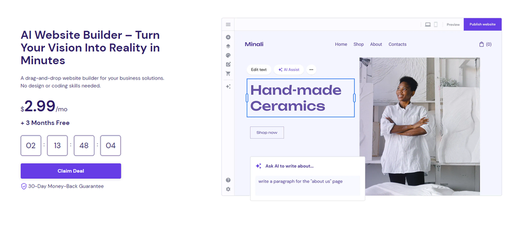 Hostinger’s drag-and-drop website builder is an excellent solution for creating a professional site quickly and easily. It helps beginners with no coding skills and experienced users who want to minimize their development time to launch and establish their online presence.