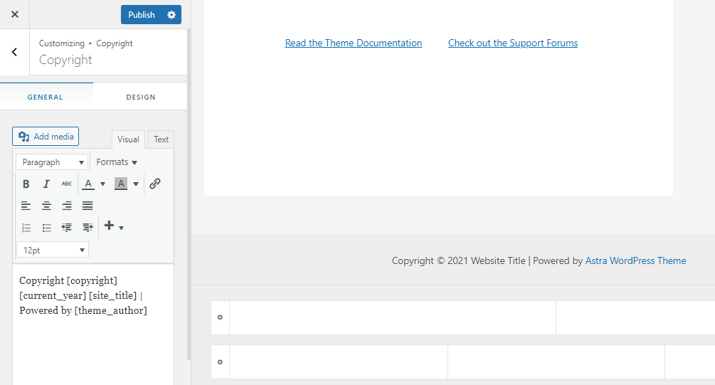 From there, remove the whole Copyright section, customize it, or only remove the credit section. Click Publish to finalize the process.