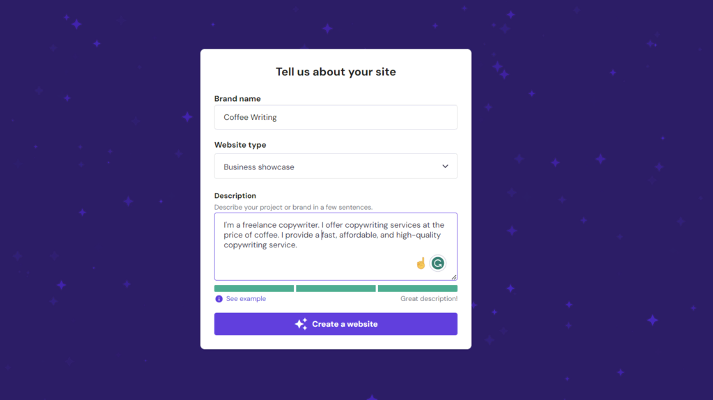 If you choose the latter, simply describe your freelance website in a few words, and our AI builder will create a professional-looking website for you instantly. For instance, below is an AI-generated example website for a freelance writer – made in just a few clicks.
