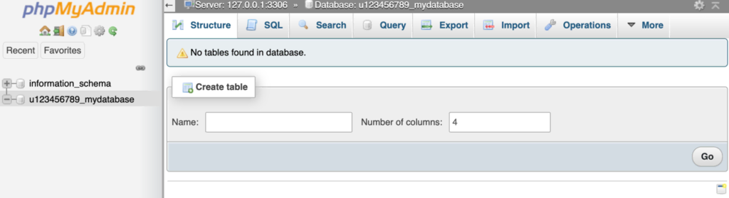 - Open u123456789_mydatabase and navigate to the Create table section.