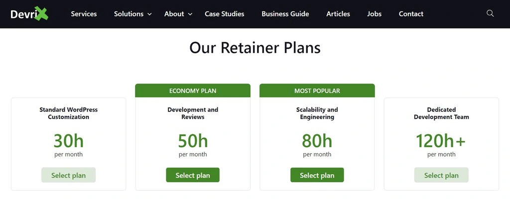 There is also time-based pricing. WordPress development service provider, DevriX, presents its retainer plans based on the number of working hours on a monthly basis.