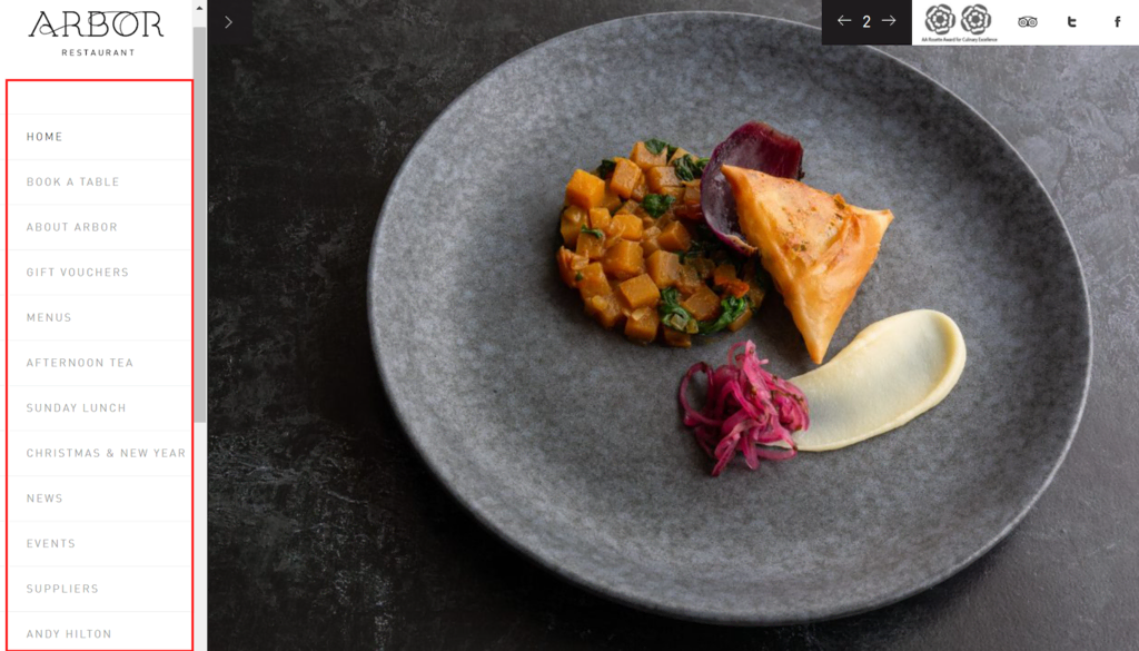 For example, the Arbor restaurant uses a scrollable vertical sidebar menu with information about the restaurant, menus, events, and booking options.