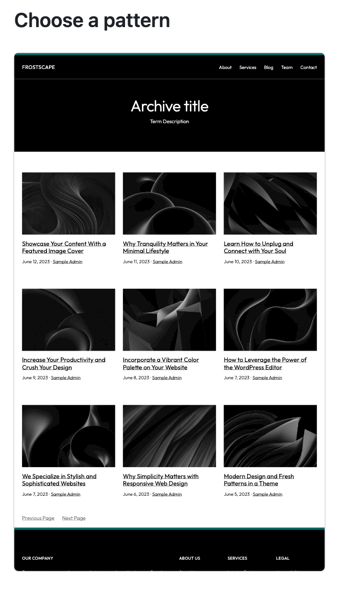 - Choose a pre-designed layout. Alternatively, skip this step and create a new page design from scratch. For this example, we’ll use an existing category archive pattern and add some custom content.