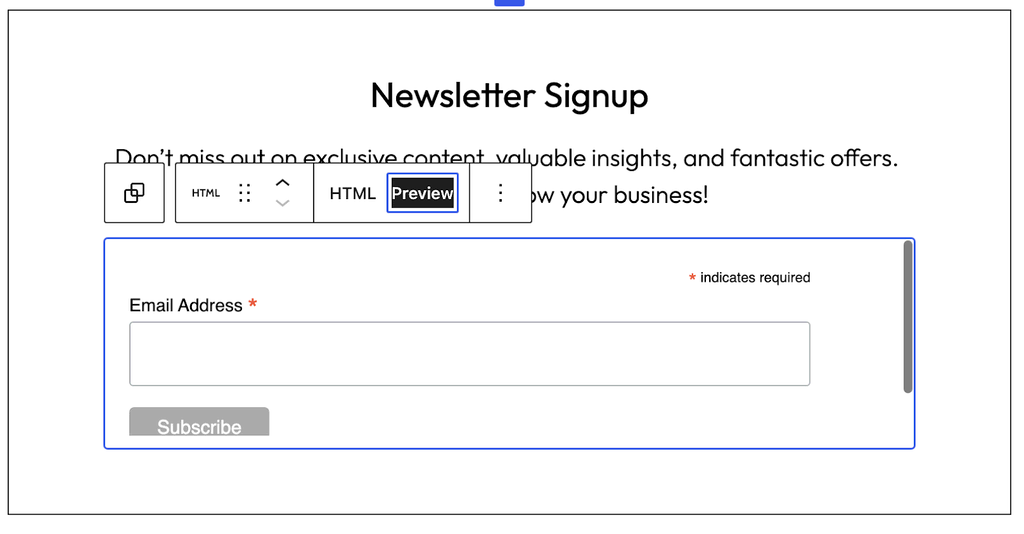 In the example below, we’ve used a Custom HTML block to display an embedded newsletter signup form. Copy and paste the code into the HTML view and click Preview to see it in action.