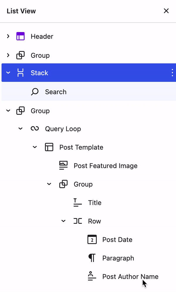 - In Site Editor, click List View to see the hierarchy of blocks in your template. Your view may look different depending on the pattern you use. If you’re starting from scratch, the only thing you’ll see in the List View is a Paragraph block.