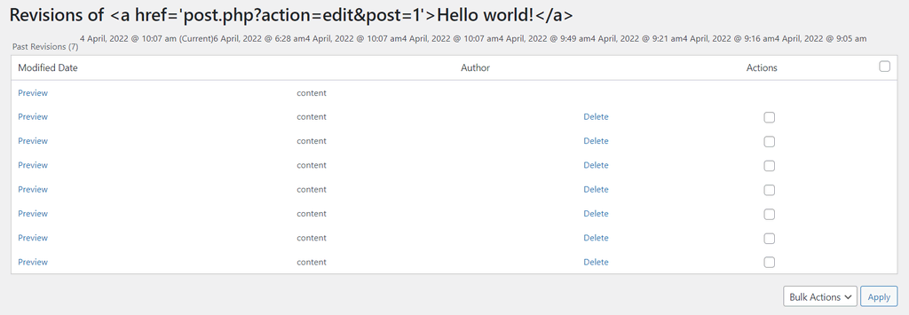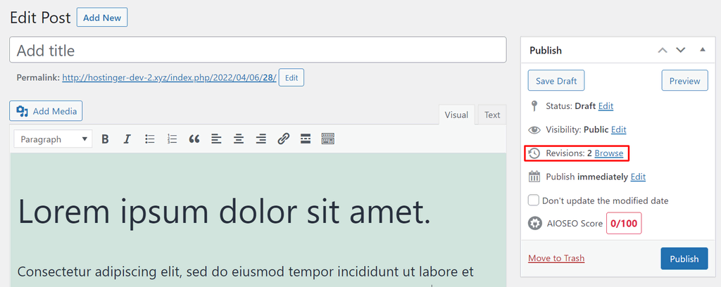 This section will explain how to view, compare, and restore old post revisions in WordPress. Note that there must be at least two edits before the revisions menu can appear.
