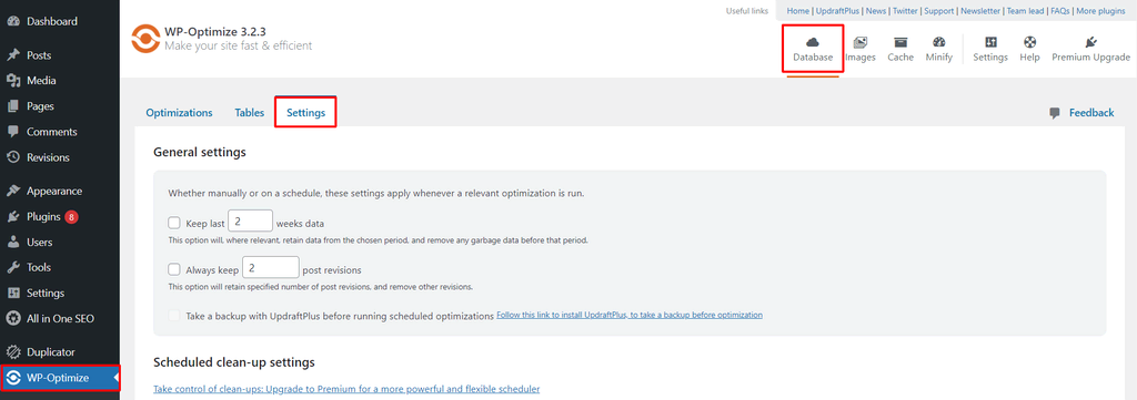 - On the dashboard, go to WP-Optimize → Database → Settings.