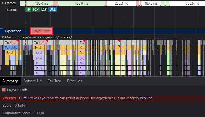 Note that there might be multiple Layout Shift tabs that give different scores due to various visual elements showing layout changes. Click on each tab to see which element is causing the issue on your web page.