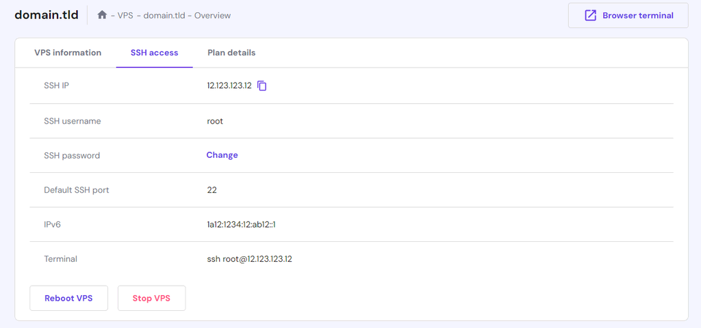 Moreover, all our VPS plans provide full root access to avoid permissions-related issues. Users can also use our built-in Browser terminal to connect to their remote server. It is more convenient than an SSH client since you can run Linux commands directly from your web browser.