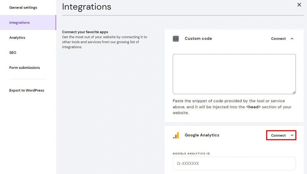 For Hostinger Website Builder users, access Analytics → Integrations from the editing interface. Click Connect next to Google Analytics and enter your account ID.