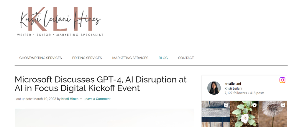 Unlike many personal websites listed here, Kristi Hines doesn’t use visuals or menu links in her header design.