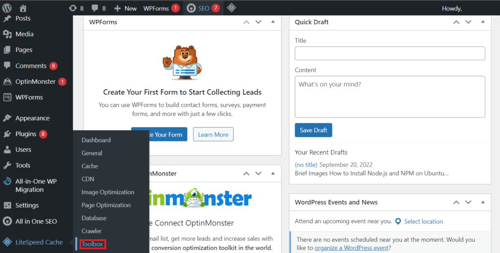 - Go to your WordPress dashboard’s sidebar → LiteSpeed Cache → Toolbox.