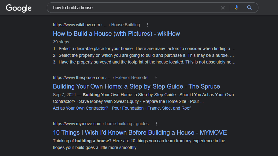 To demonstrate, here is a query on how to build a house and the Google SERPs listing links to different websites. Google looks for websites that provide the most suitable answers to this search term.