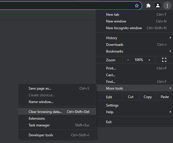 - Click on the three dots menu to the right of the address bar and select More tools -> Clear browsing data. Google Chrome will direct you to the Settings page. Another option is to enter Ctrl + Shift + Del on your keyboard.