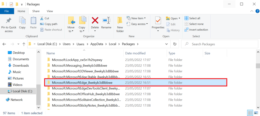 - Find and delete the Microsoft.MicrosoftEdge_8wekyb3d8bbwe folder.