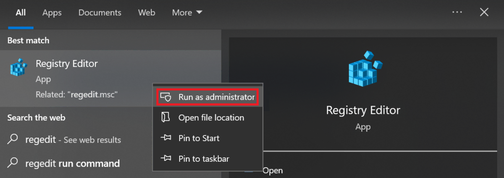 - Right-click on the Registry Editor icon -> Run as administrator -> Yes.