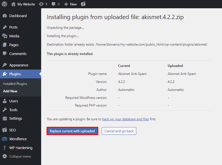 In this case, WordPress will ask for permission to overwrite the old plugin or theme folder. Select Replace current with uploaded and the “Destination Folder Already Exists” error message should be resolved.